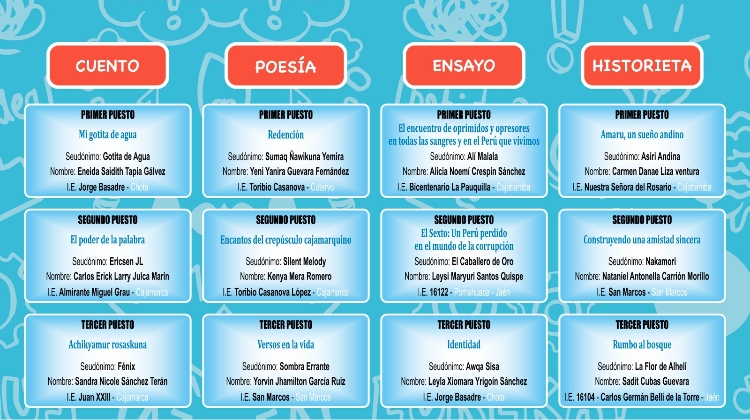 La Unidad de Gestión Educativa Local de Jaén, expresa su profunda felicitación a los estudiantes de las instituciones educativas que resultaron ganadoras en concurso literario escolar regional; resaltando su destacada labor y compromiso, alcanzando resultados de esta índole.
